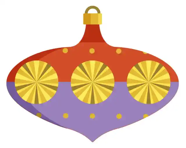 Ziemassvētku uzlīme “Padomjlaika eglīšu mantiņa kā violets un sarkans šķīvītis ar dzelteniem apļiem”